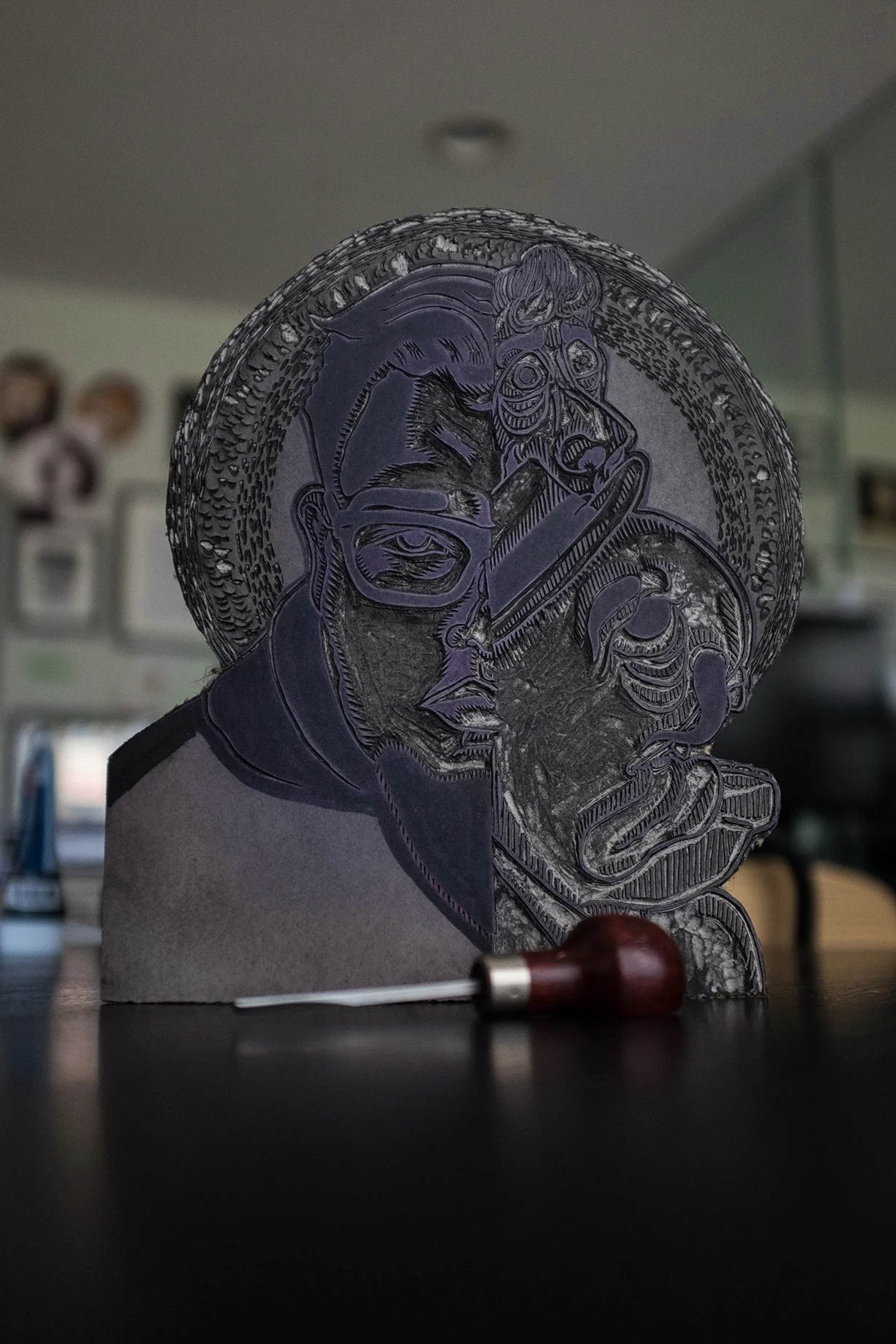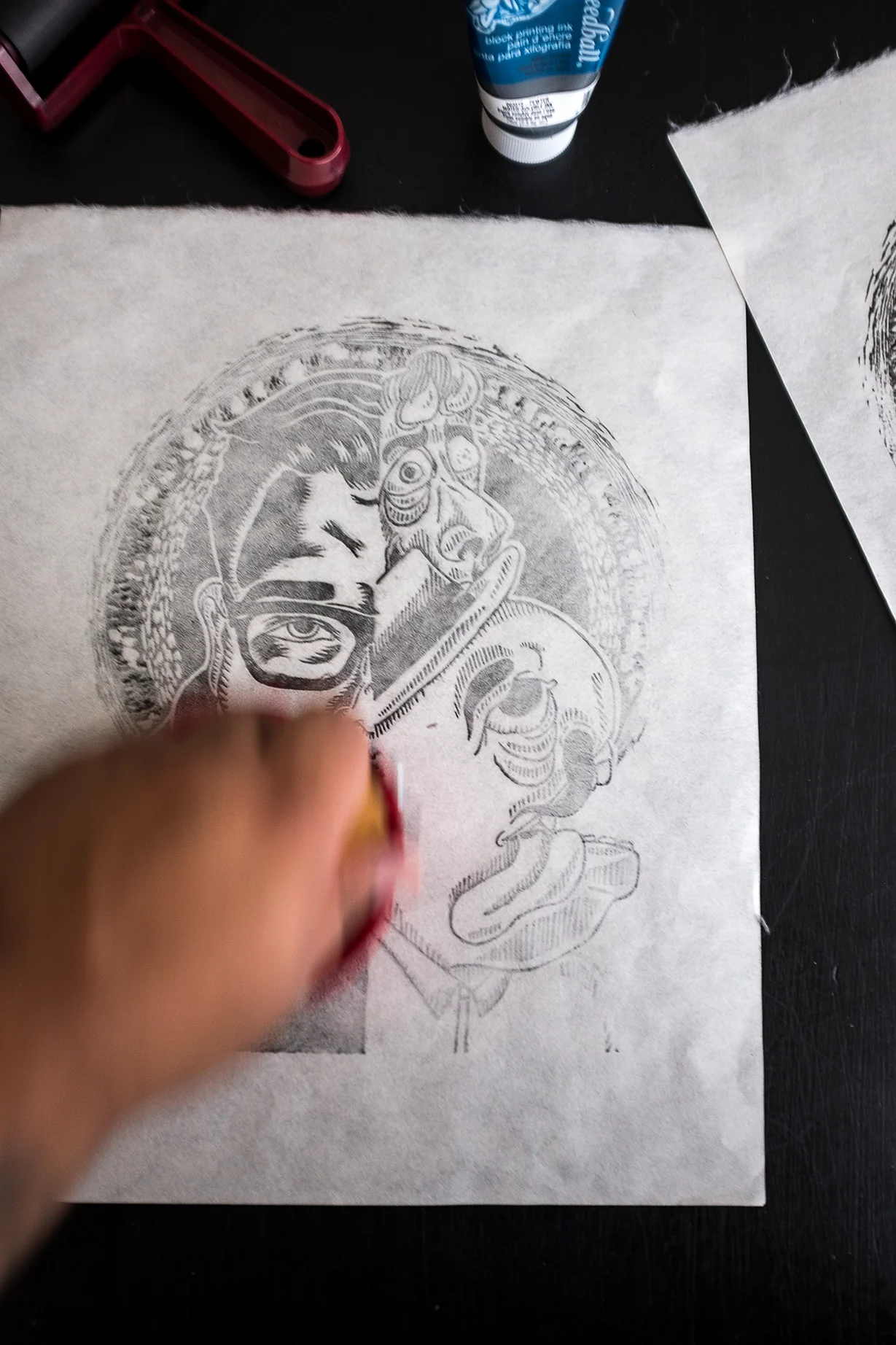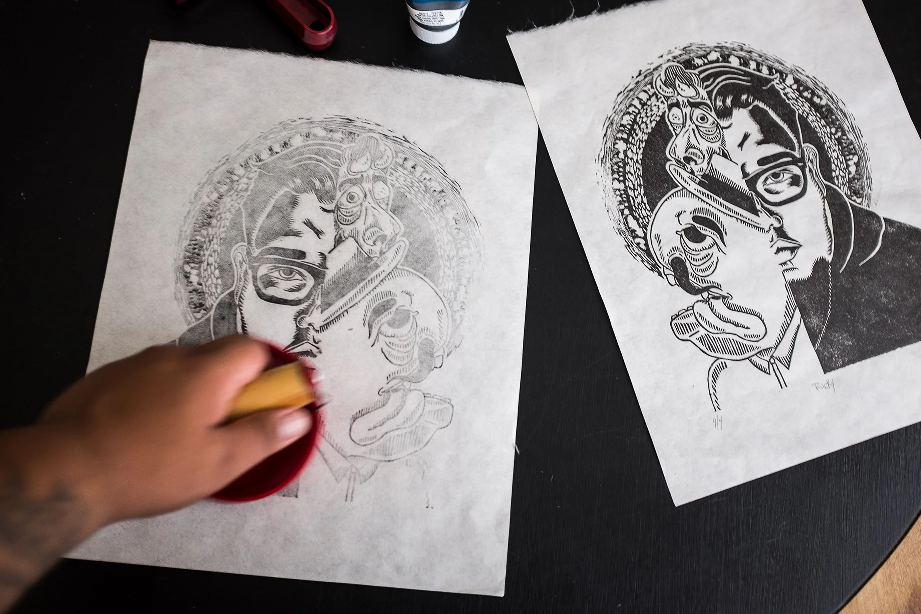 11"X13.75" Self portrait "Ricky" an illustration of me and my imagination. A linocut series of 4 hand-printed prints.