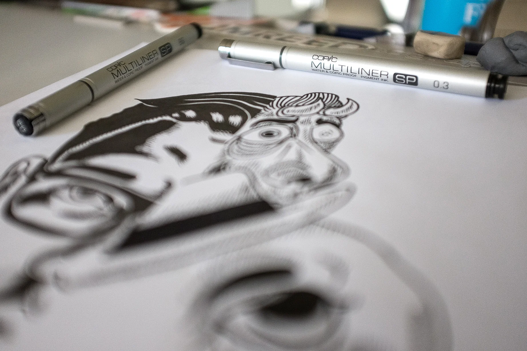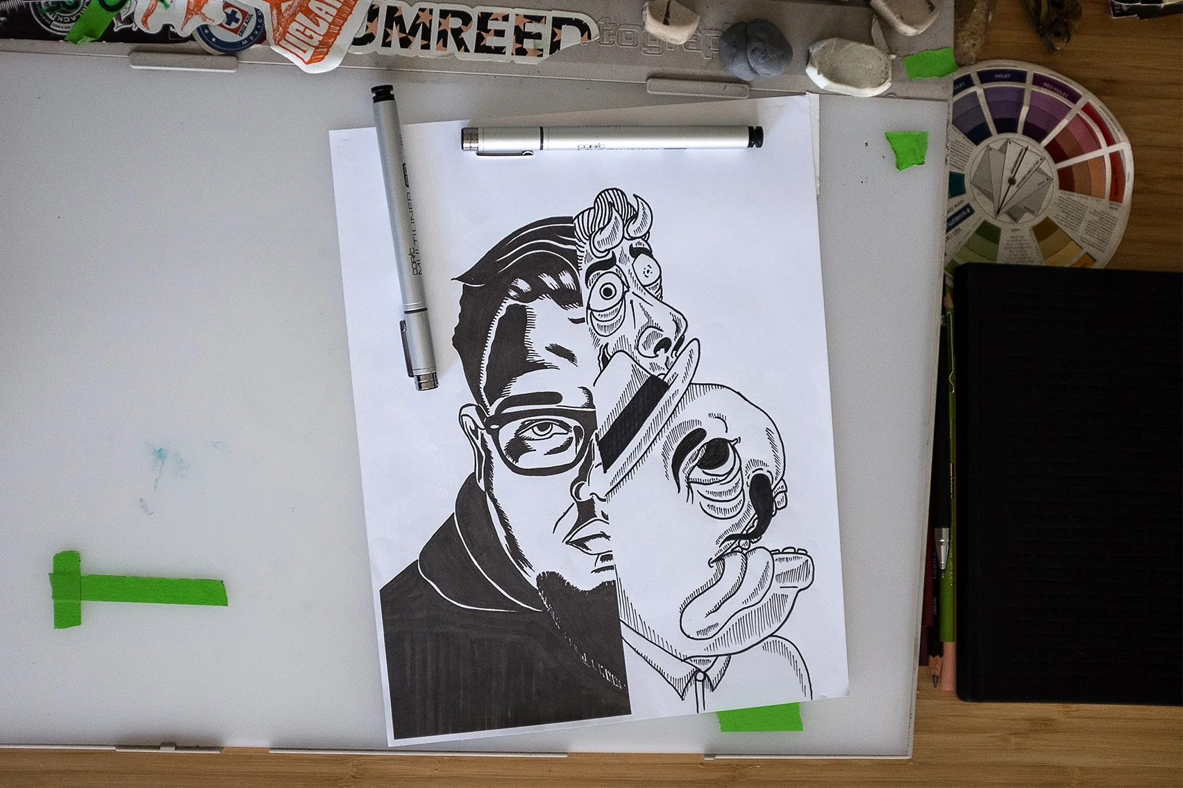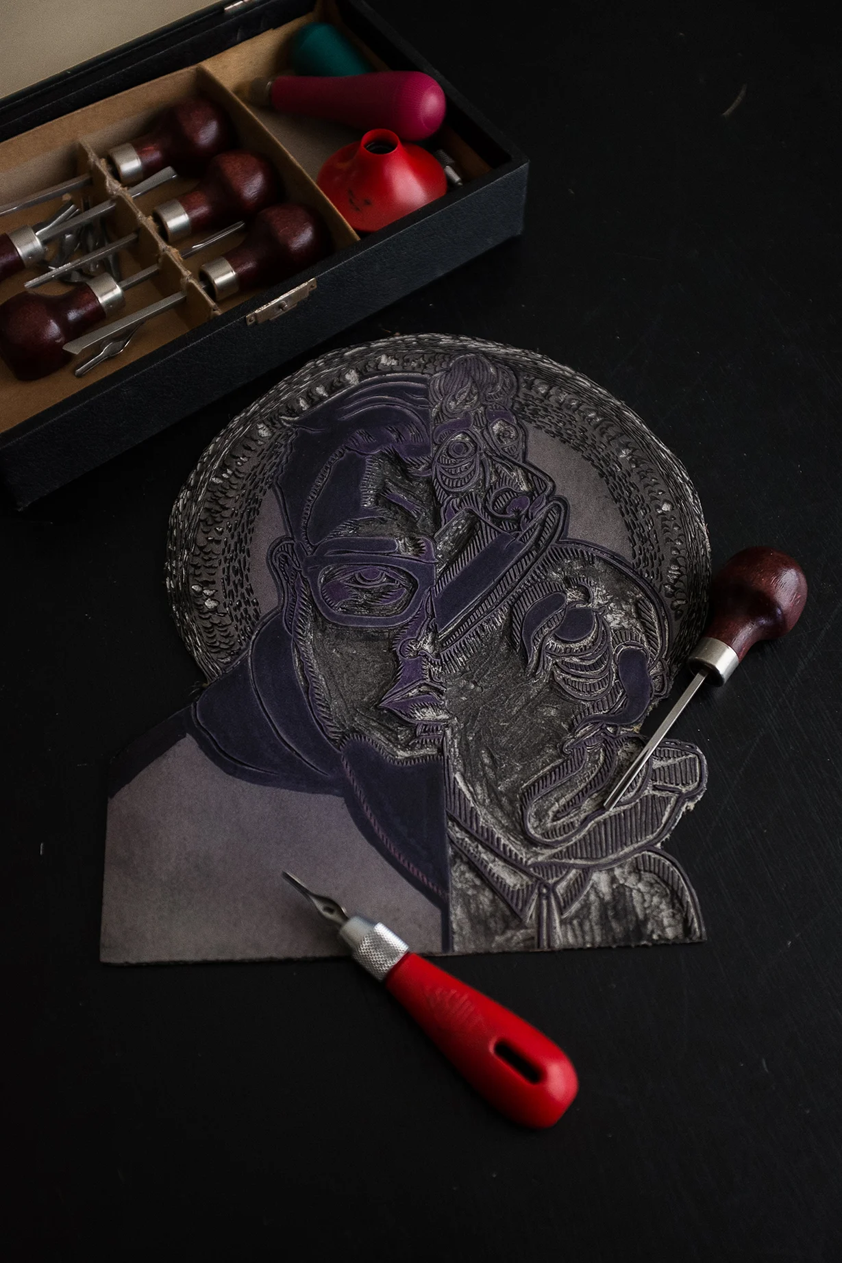 11"X13.75" Self portrait "Ricky" an illustration of me and my imagination. A linocut series of 4 hand-printed prints.